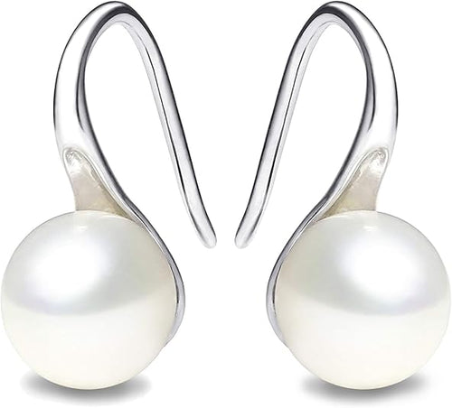 925 Sterling Silver Hoop Handpicked AAA+ Quality 7.5-8mm White Freshwater Cultured Pearl Dangle Drop Earrings Jewelry for Women